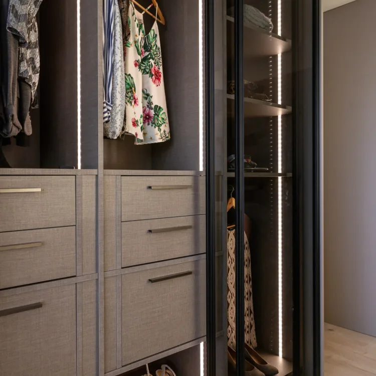 Bij Aanhuis.be maken we je schuifdeurkast op maat. Er zijn talloze materialen, afwerkingen en extra opties waar je uit kan kiezen. Denk aan schuifdeuren met glas of verlichting onder de planken, etc. Hierdoor hebben wij altijd een kast die aansluit bij jouw interieurstijl. En omdat onze schuifdeurkasten op maat worden gemaakt, sluiten ze altijd aan bij je ruimte, maar ook bij jouw wensen en behoeften.