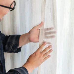 Het maken van straffe keuzes voor de woonkamer begint met een opvallende basis! Daarom kiezen we voor het parket van Bjelin. Deze vloer combineert het onderhoudsgemak van vinyl met de warmte van een houten toplaag – perfect voor een gezellige, natuurlijke uitstraling. Maar uiteraard mag een fluffy vloertapijt van Best Wool niet ontbreken. Bart kiest voor een prachtige, zachte creamkleur, die de ruimte een frisse en speelse toets geeft. Om het geheel af te werken, wordt er ook gekozen voor een stijlvol wavegordijn van Vadain in kleur 15 Pebble!
