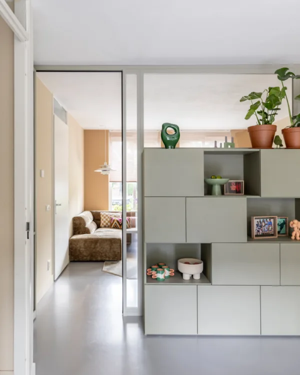 De kast is uitgevoerd in de kleur Ovatta, een mooi vergrijsde groene tint waar Andrea blij van wordt, maar met de strakke vormgeving waar Bas zijn hart sneller van gaat kloppen.